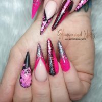 We want to see what you’re wearing on your nails! Kirsty Coltman, of Glamour and Nails, wears an eye-catching pink and black nail look. “I created these nails using Team Gorgeous Acrylic. The colours are beautiful and I used Pop Tart, New York and Clear Candy. For the glitters I used All That Sparkles glitter…