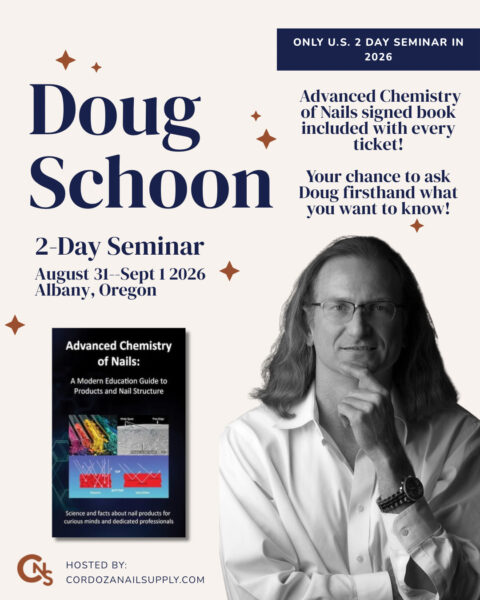 Join Cordoza Nail Supply for a two-day seminar dedicated entirely to nail science expert, Doug Schoon. This will be his first US seminar in over 10 years. The in-depth educational experience will be built around Doug’s latest book, Advanced Chemistry Applied…