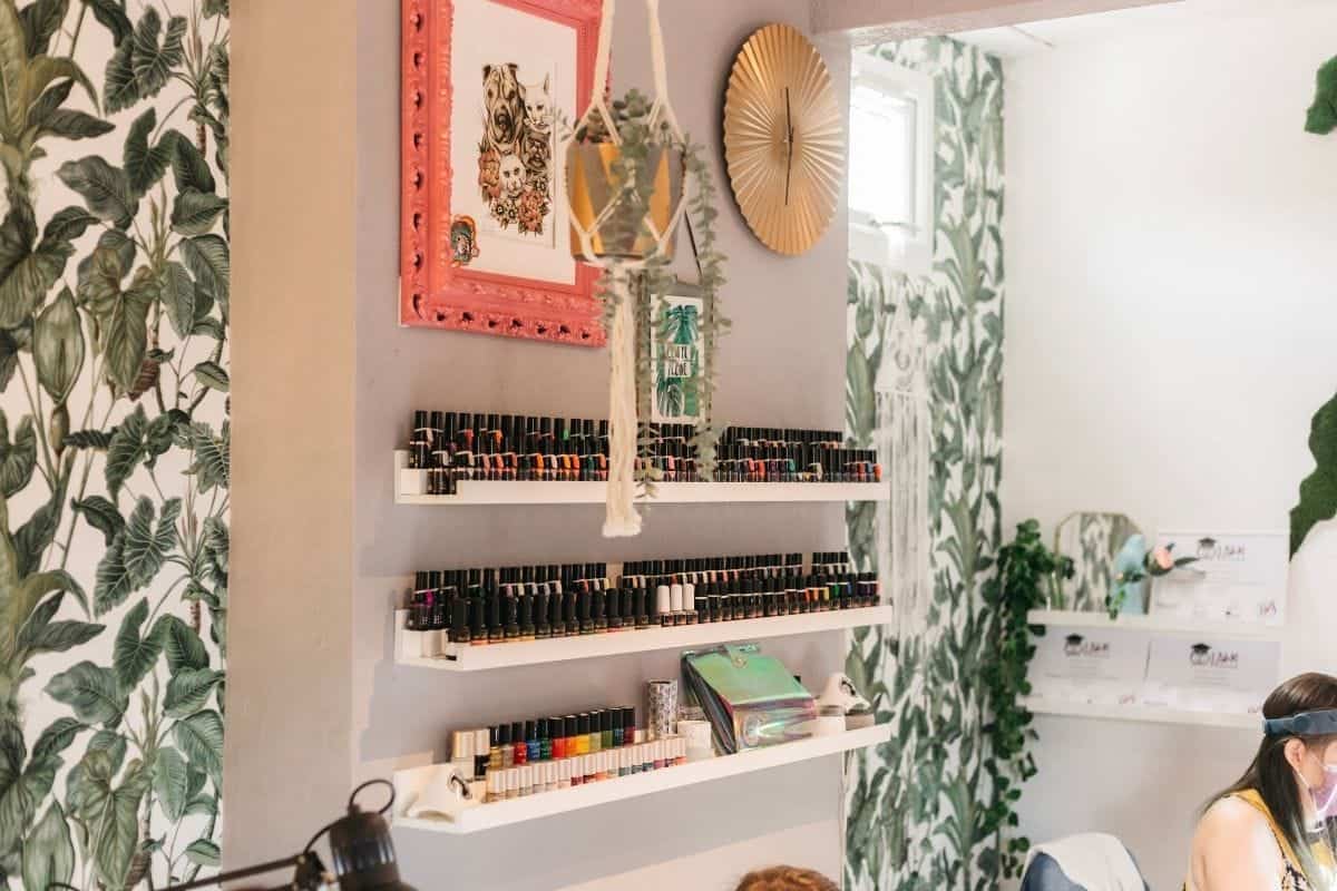 “There are 2 rooms, but the studio is open plan. Clients enter straight into our pedi area and then come through the pom-pom curtain into the large main room, where all three of us have our nail desks.”
