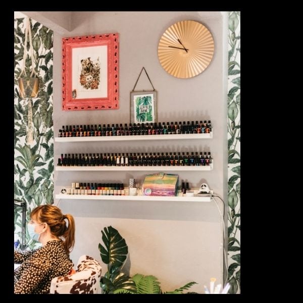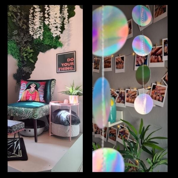 “I wanted the studio to reflect my own eclectic personal style, be warm and welcoming, so the client experience is like visiting a friend’s house. I make sure the space smells amazing by using aromatherapy diffusers and Tisserand oils and we usually play lo-fi or trip-hop music, so it’s all very relaxing even if we’re busy. I also want the space to be creatively inspiring, to give clients the ‘ok’ to ask for and have whatever they want on their nails without feeling silly, so there’s loads of stuff to look at on the walls, including polaroids of client’s nail art. There are pieces in the studio from my home, some of my artwork and I created a lot of the decor too, such as the pom-pom door curtain and the plant walls.”