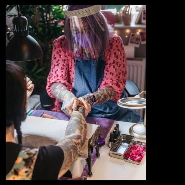 Moving onto nails after changing her career path due to illness, Lucy shares, “I became debilitatingly ill in 2012 and was forced to stop working in my previous careers as a graphic designer/illustrator & florist. I physically couldn’t work for the next six years as I was so ill and my mental health suffered as a result. After getting my own nails done in an NSS salon for a holiday (I’m sorry), and being horrified at the state of the nails and overall experience, I spent the entire holiday researching reputable professional brands and training courses. Two weeks after I got back from my holiday, I started my Bio Sculpture training! I knew exactly what type of nail services I wanted to offer and felt that Sheffield was missing it. I wanted to specialise in nail art and gel nails (to be free of the sometimes overwhelming monomer smell of nail salons), offering fully vegan nail services and run as ethically and low-waste as possible. I started working part-time as a mobile nail tech, which lasted about nine months until I couldn’t physically carry my kit around with me anymore. I rented a desk in a friend’s hair salon for around a year and grew my client base. I did further training with INK London in UV/LED hard gel, e-file and acrygel, and then in the first lockdown I took the plunge and got my own studio space, despite not knowing how things would turn out due to the pandemic. It was the best decision I ever made! The studio is on the first floor of a former industrial building in a rapidly evolving area of Sheffield called Kelham Island and was being used as a meeting and store room before I took the space over.”