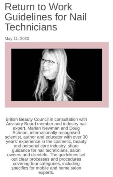 The British Beauty Council (BBC) is working with the government and providing a voice for the nail industry (you can become a member for free and add to this voice by joining here). The BBC has consulted advisory board member and nail expert, Marian Newman, and cosmetic scientist, Doug Schoon which is available to view to produce return to work guidelines for nail technicians.