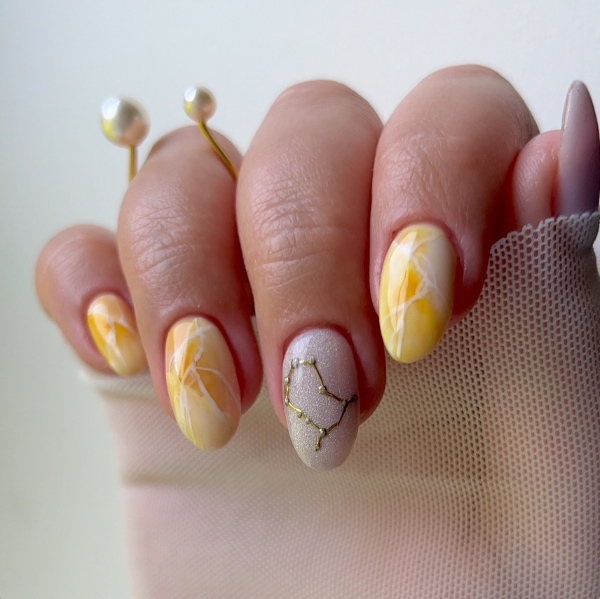 Stephanie Connolly serves up pretty citrine nails with a Gemini constellation.