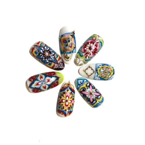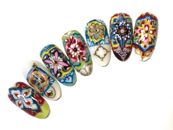 Cat has taken the styling of pottery, tiles and fabrics to create a series of Bohemian nail styles that are arresting to behold.