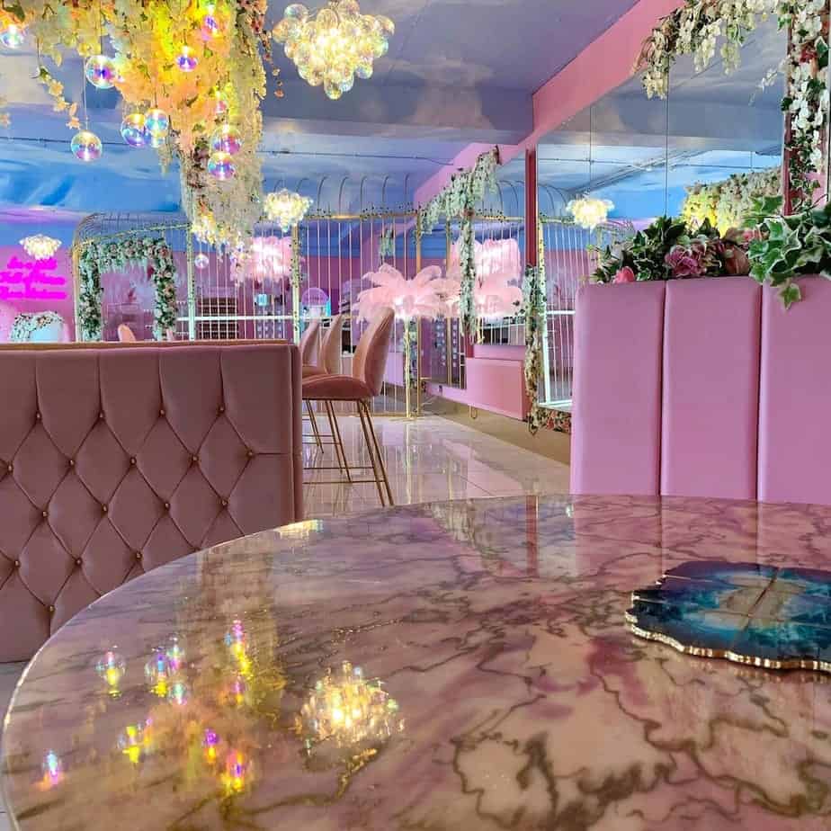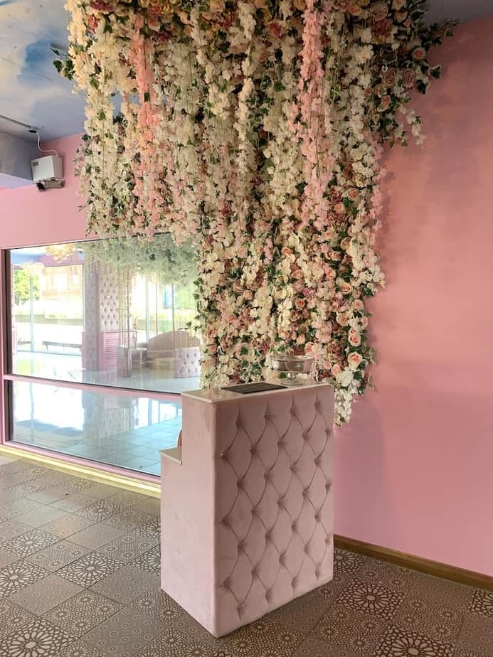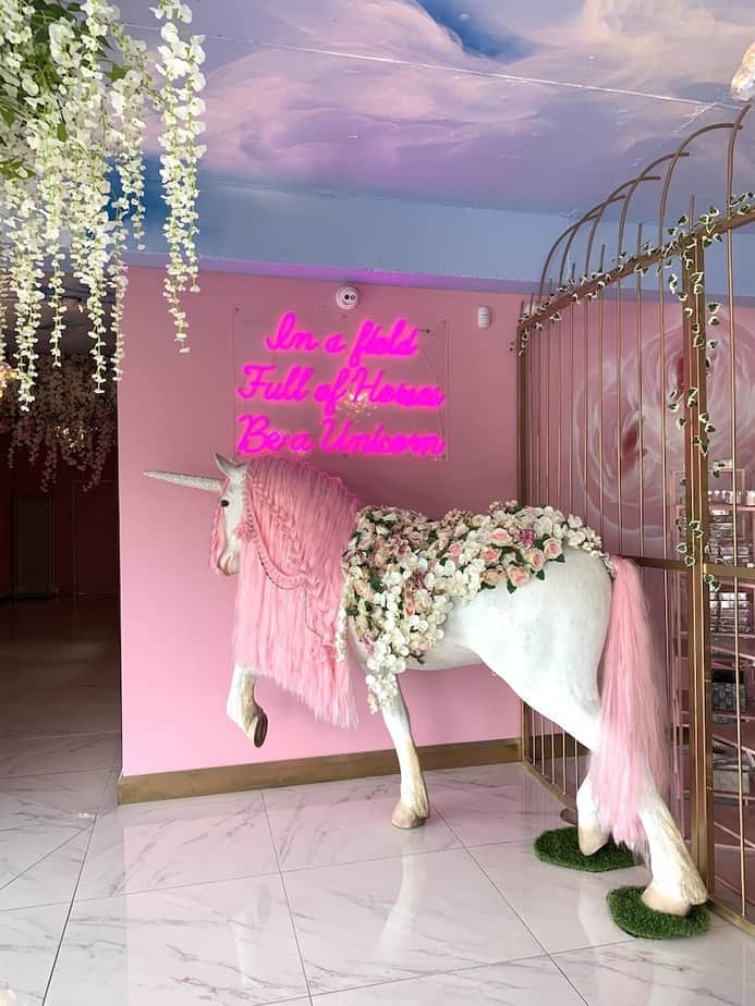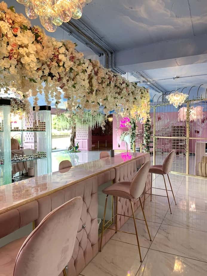 Every tiny detail in the salon has been analysed and thought out by Annabel and Elliott, from the handcrafted flowers to the birdcage-inspired structures. Marble lines the floors of the main salon space, as well as making an appearance on coffee tables and the salon’s central feature – the nail bar. Plush baby pink buttoned material cascades down the sides of the nail bar and lines the sofas that offer a soft, welcoming place to relax pre and post treatment. Nods to nature can be found in every corner of the salon, as blossom trees and flowers flow overhead and spray painted roses line the walls, while Annabel’s love of animals is also prominent in the form of a fish tank, a peacock sculpture and life size unicorn – of course, complete with a pink mane and crystal-encrusted horn, hand placed by Annabel. A golden bird cage-inspired structure separates the nail area and the Nails by Annabel product shop, where techs can come in and purchase their favourite Glitterbels products.