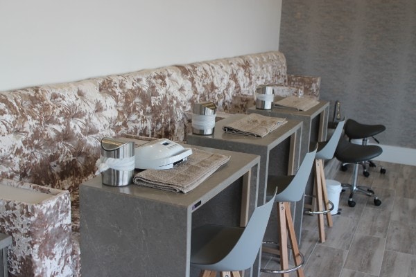 Each way I turned, there was a touch of detail to admire; from crushed velvet fabrics to unusually shaped stone basins and the incredible ceiling – a mass of white flowers. Georgie and Jazz revealed that they wanted to reflect touches of nature in their design, so light wooden flooring complemented stone-style nail desks (custom designed and built) and calming tones of grey, greige and cream.