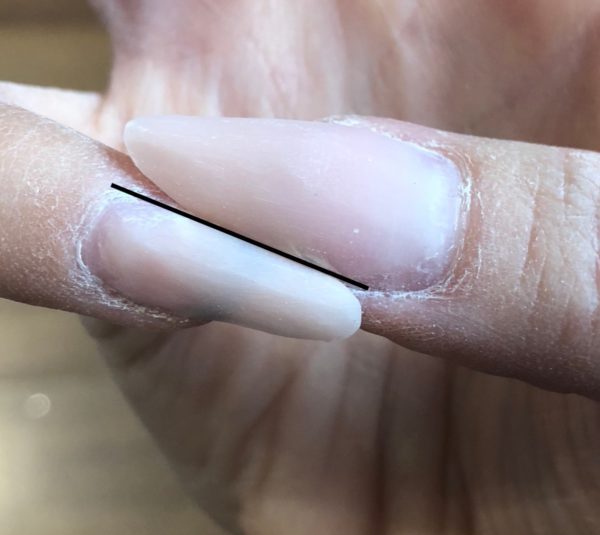 As a guide, the three middle fingers (index, middle and ring) should be the same length and the pinkie and thumb should be the same length as each other when placed side by side from the cuticle on the pinkie to the corner of where the natural nail free edge ends on the thumb (see photo below) to achieve a harmonious look that flows. To check the consistency of lengths of the middle three nails, hold the three nails together at the same position. You can hold a file under this to check the free edge consistency. Both hands should also be measured together. The nails must also match hand to hand from cuticle to free edge.