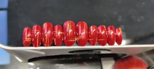 “I used Nailchemy’s Brandy Snap shade for the nails. Red is the colour of love and I wanted to portray that within the images, that even in a dark and sad image there is always love. I added some gold accents to complement the gold cracks, using Nailchemy Artisan paints on the face of our model, Emilia. The red and gold contrast beautifully. After doing a couple of test shots, I decided to add a matte finish to the nails to make the gold elements stand out.”