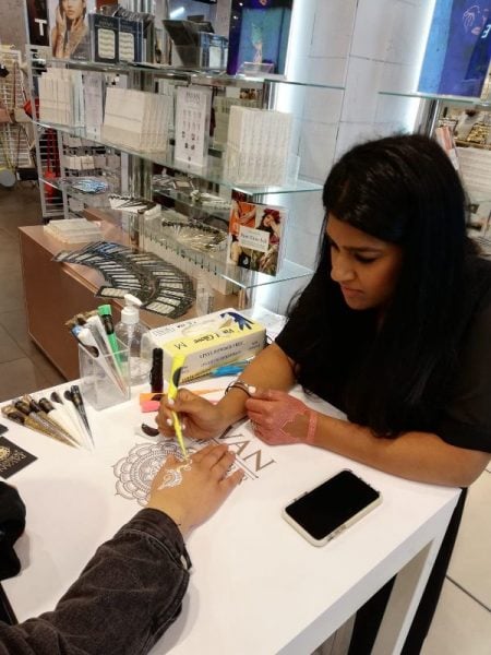 She has since opened pop up henna bars in Selfridges, Harvey Nichols and Topshop and is renowned for her unique collaborations, including the feature windows at Harrods and Force India Formula One cars, as well as with celebrities from Rudimental to Ellie Goulding, Perrie Edwards and Alesha Dixon. She has created bespoke designs for the runway shows of Antonio Berardi and Manish Aurora.