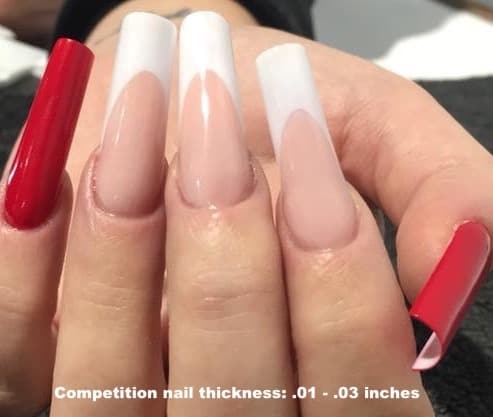 A salon wearable nail should be the thickness of credit card at the free edge (approximately .03 inches). Competition nails should be thickness of a business card at the free edge (approximately .01 to .03 inches).