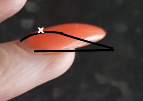 The apex doesn’t need to be a large mound; around twice as thick as at the free edge is enough for a salon wearable nail. From the cuticle to apex should just be a gradual incline, with the upper arch coming out in a straight line to the free edge and not a steep step. Only the angle of this upper arch changes with shape and length. There should be no curved upper arches as this curve is product that is not needed. It is important to remember that the apex is a just a point, not a band and doesn’t run from one side to the other, otherwise the nails will look ‘pregnant’ instead of slim. You can achieve this by ensuring your convex and concave are the same thickness and sticking to the rule of the apex only being a point.