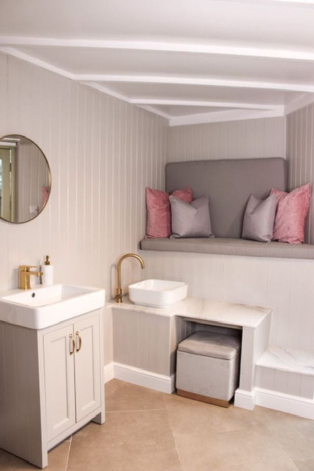 “The Parisian-inspired décor can be found in the grey shades used and panelled walls. The gold elements are a nod to the classic French Baroque style. There are some touches of gold in the gilded mirror, tap fixtures and the contemporary furniture.