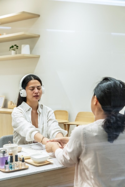 “All staff wear name tags and are introduced by name to clients. During appointments, clients and nail specialists are seated at the same level to eliminate any hierarchy of staff or client. I want to make the nail salon feel more welcoming and, in turn, a better place for nail specialists to work.”