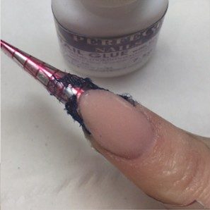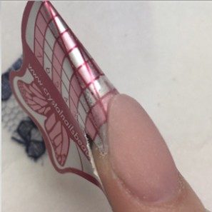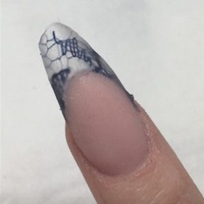 I prefer to use glue for thicker items such as lace. Apply a very thin layer of clear acrylic or gel and wait till fully cured, place some nail glue on this clear platform and then press in the item, holding in place until the glue has dried. Trim any excess and ensure nothing is overlapping the sides or free edge, otherwise it will not create the ‘capsule’ and you will have a gap in your enhancement.