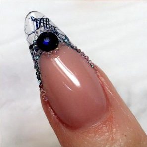 The exact area in which you encapsulate particular items is important to consider and the understanding of a well-structured enhancement is necessary. You should encapsulate items, especially those that are thicker, in the thickest areas on your enhancement and avoid the thinner areas. Consider the thickest areas of your enhancement – this is usually the smile line, apex or the centre of the free edge. The areas to avoid are the cuticle zone, free edge and side walls as these are thinner and you will be forced to either leave unsightly bulk, or file through your design.