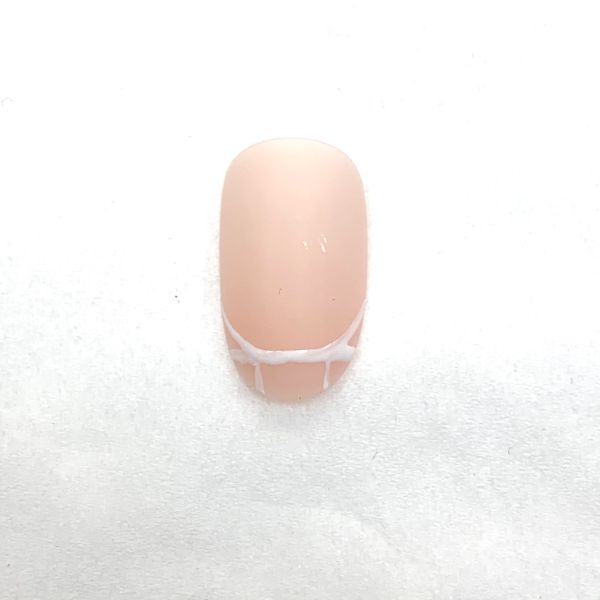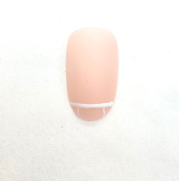 Some techs favour painting a smile line freehand with the polish brush, while others prefer to use a fine line brush or a dotting tool. It is important to ensure that the corner points of the created smile line start at the same point and the angles are symmetrical. One of the easiest ways to achieve this is to use a brush to grid out the free edge. This way you can also correct any imperfections on the client’s natural nail, too.