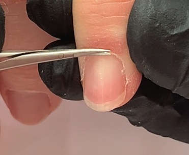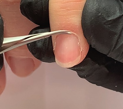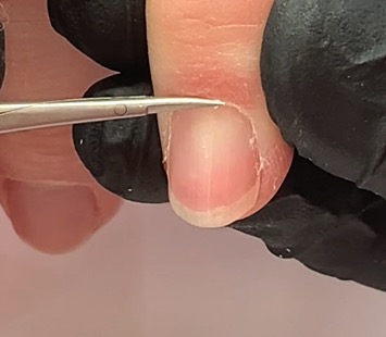 Step 3: Remove any remaining cuticle or hangnails using cuticle scissors or nippers. The small white pieces of remaining cuticle will be easy to distinguish from the undisturbed eponychium.