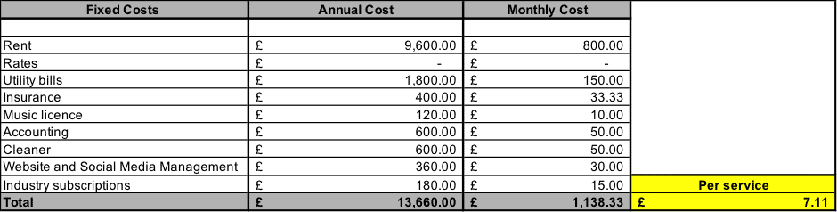 Fixed costs per month: £1138.33 / 160 = £ 7.11 per service