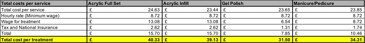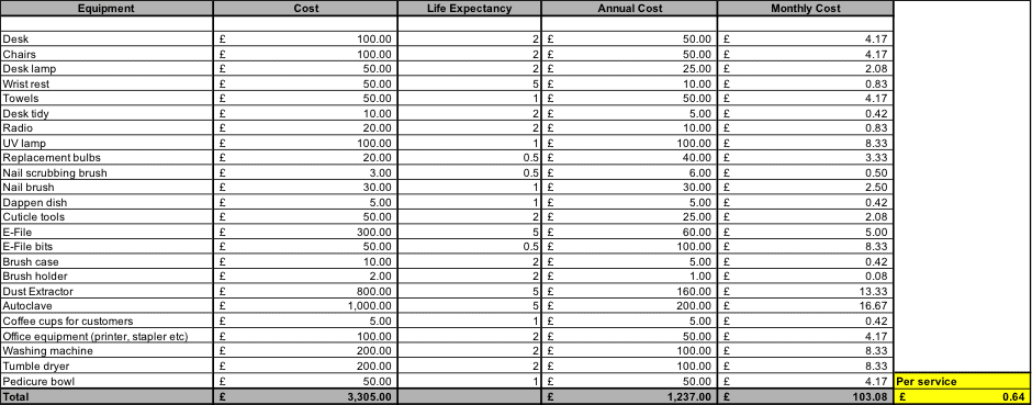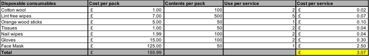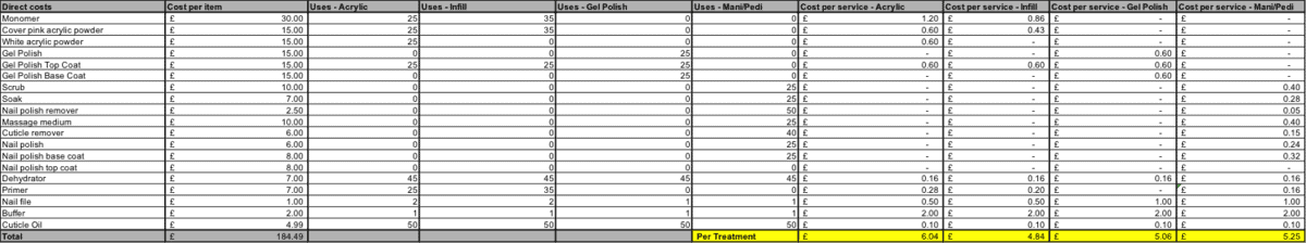 - Work out your direct costs such as product cost per service. While cost could differ depending on variable factors – such as length of nails e.g. longer nails will require more product, you can calculate the average cost.