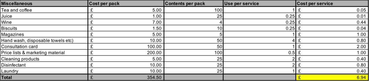 Outgoings are not just the ‘on desk’ products. Outgoings are composed of running costs, disposables, equipment, products and a take-home wage on top.
