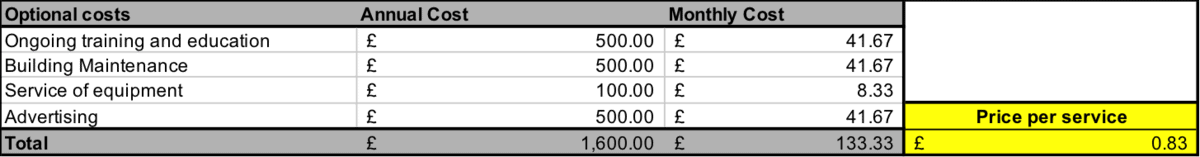 Optional costs per month: £91.68/160 = £0.83 per service