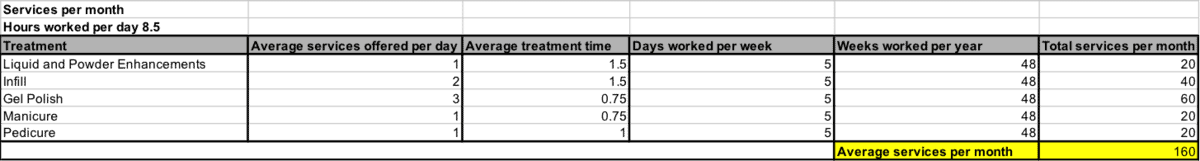 a) Calculate this by the average amount of services you offer per day. Let’s base this example of a full time nail tech working 8.5 hours per day, offering a typical daily column of: