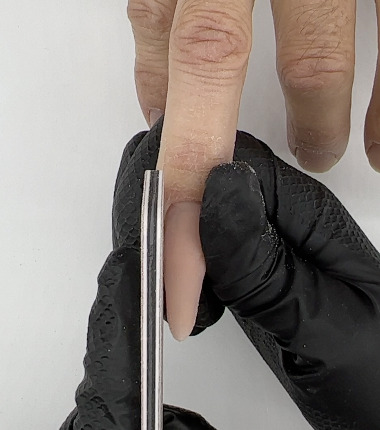 Whatever you do on one side of the nail enhancement, you must repeat on the other to achieve uniformity. How you file on one side must be mirrored on the other. Following a consistent filing routine is essential for this. The way in which you hold your file is also key. It must be held flat against the sides of the nail and roll over the enhancement.