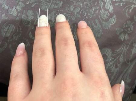 The right nail has a slight roundness and bulging, indicated by the line. The key is not to file down the natural sidewalls and remove strength, but along the side panel as indicated by the circle on the left nail.