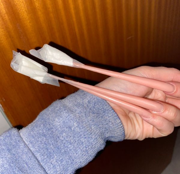 “In order to practice the ‘HD Ultimate Extreme Stiletto’ technique, I dug out my extra long nail forms from Krista Paulitti – these are the longest I own! I decided to use acrylic; my favourite system as it’s more sturdy to file once set than the HD Eeeze Gel system. I didn’t prep my nails fully, as I didn’t plan to keep the stilettos on for too long. Instead, I pushed back the proximal nail fold and applied Minx coat (a clear wrap type coating that I can sculpt over and then peel off).