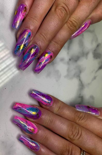 “The design was inspired by a mixture of designs and patterns on Pinterest, but the colours were chosen by my client,” explains Claire. “I used The Gel Bottle Inc gel polish colours Pink Daisy, Cinderella, Purple Margarita, Daisy & some gold foil.”