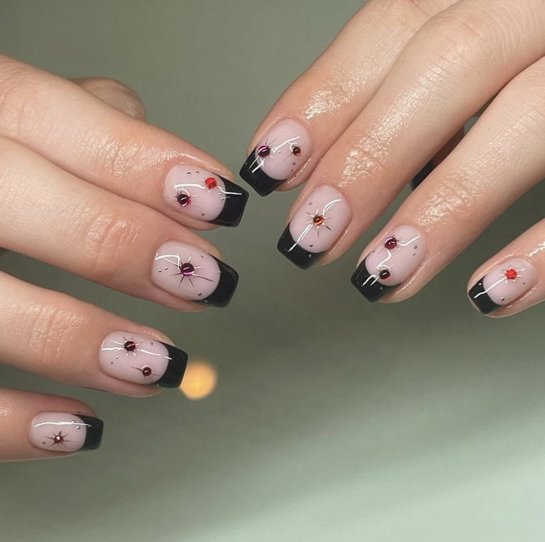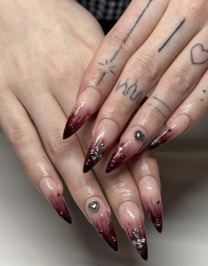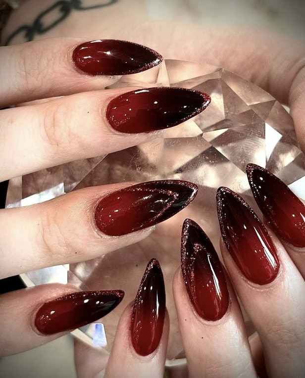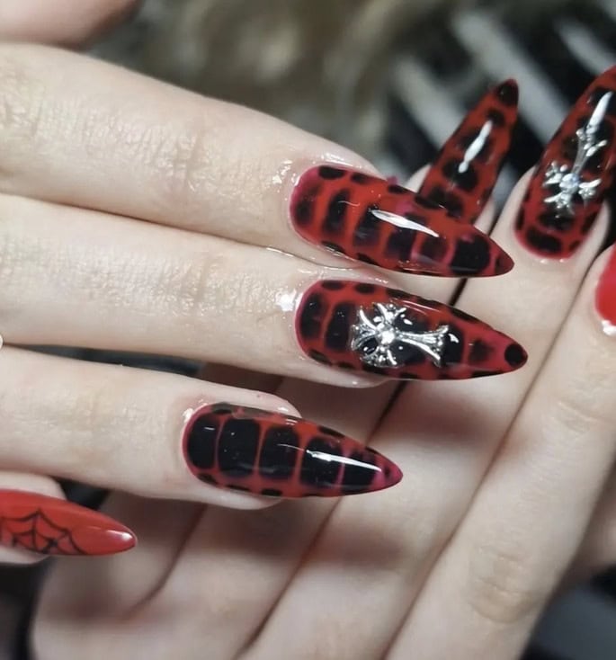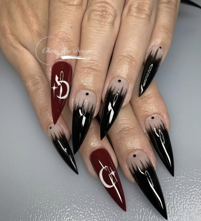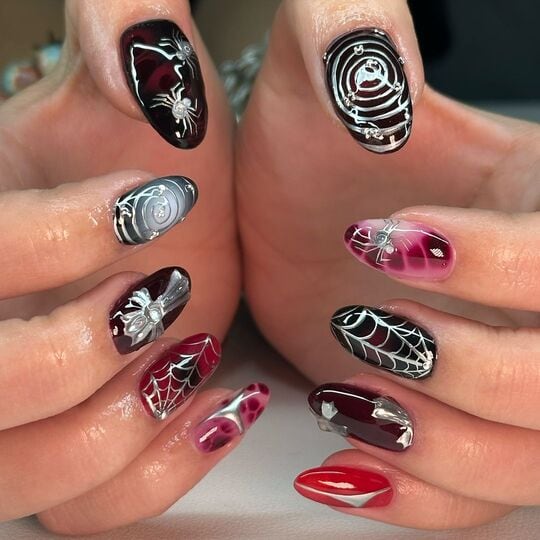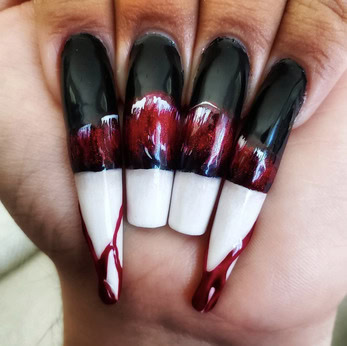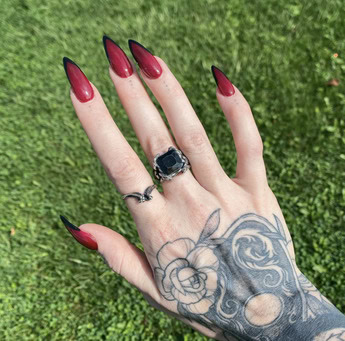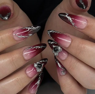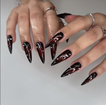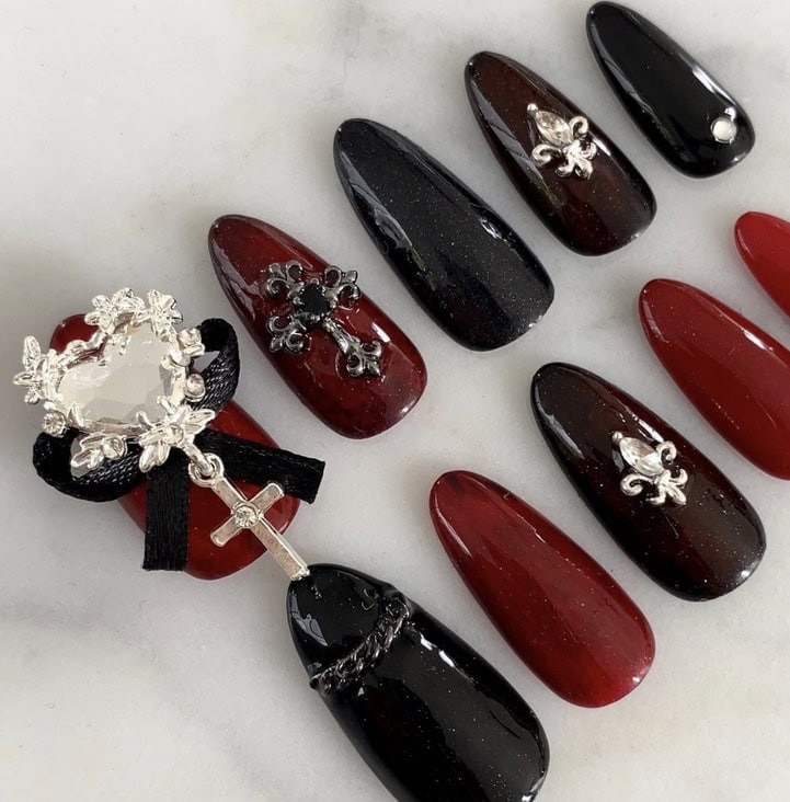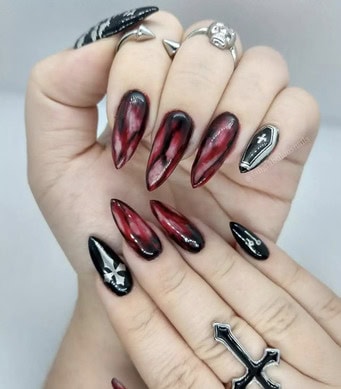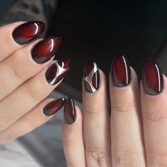 What are vampire nails? Well, think red, black and dark hues with silver, chrome details – a manicure that’s perfectly fitting for autumn and Halloween season.