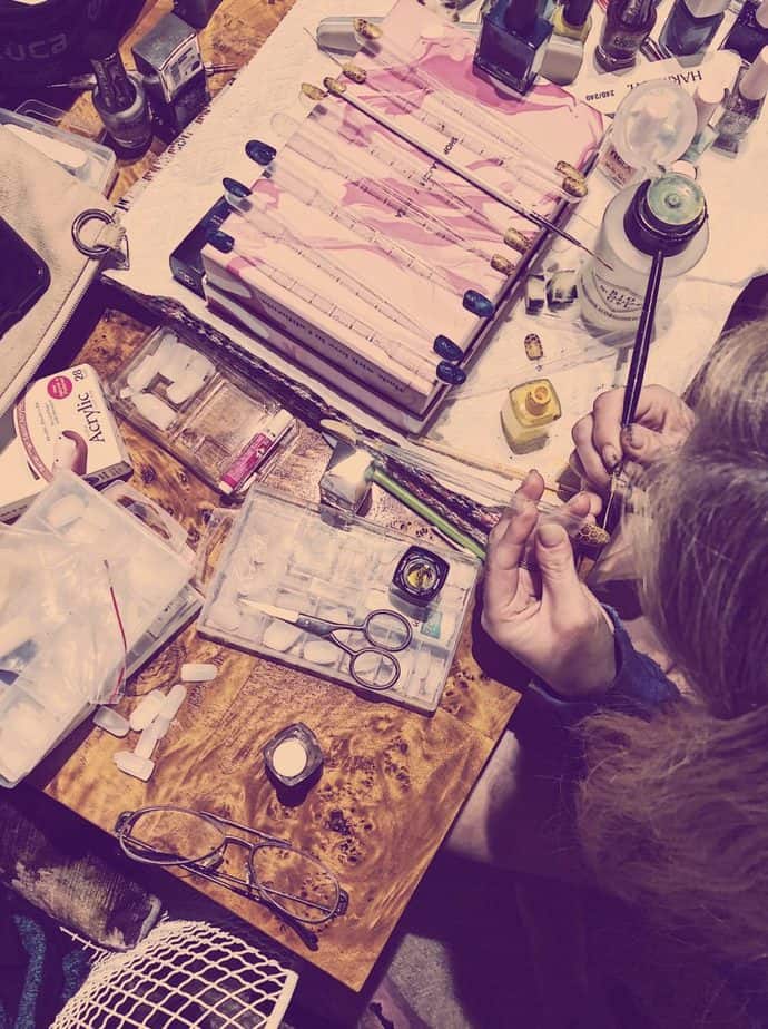 My days can range from an early start at 7am in a house on the beachfront in Malibu for a magazine shoot or a day in the studio shooting a music video. Some days have seen me give my loving and loyal friends some crazy nail art designs, and one day I pended to a private client in the Hollywood Hills who offered me a glass of Aperol Spritz while I did her mani/pedi. Another booking saw me prep 30 freehand honeycomb nail art press-on nails all through the night until 4.30am ready for a shoot. My workload really is different all the time, but whatever the day has in store, I love it and give it my all.