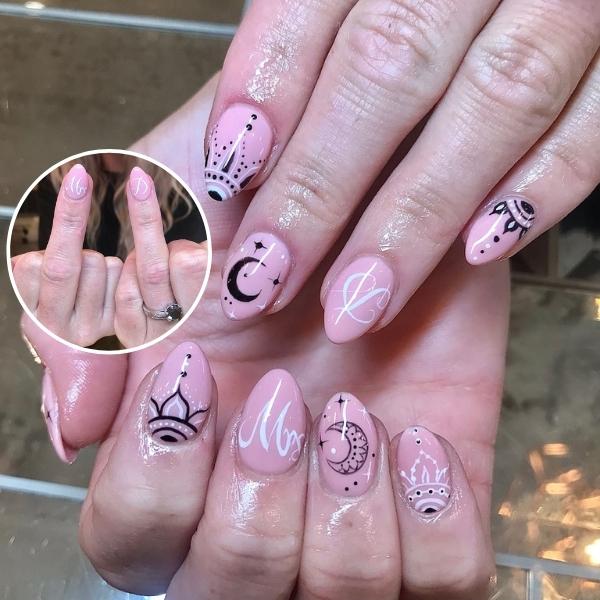 “Knowing that she wanted to keep the wedding a secret, we designed discreet nails that nobody would guess were wedding nails, with a hidden message (‘Mrs D’) on her middle fingers to later reveal her new surname in her own mischievous way. She wanted to complement her black diamond wedding ring with neutral tones, so we opted for a delicate monochrome vibe.