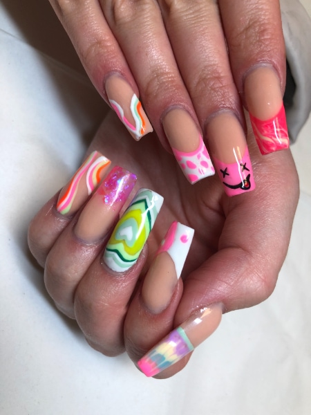 “I absolutely love working with gel paints. I love Aztec-inspired designs, swirls, characters, theme nails and of course all things bling and sparkles! I don’t think there is anything I don’t love when it comes to nails, and I’m always up for a challenge.