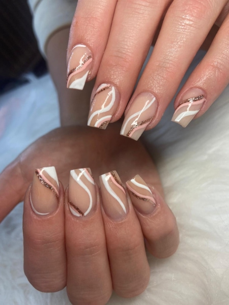 “I usually have a short almond acrylic set on my own nails. I love anything anything nude or rose gold on myself – but sometimes I have a baby pink or a nice French,” she shares. “They don’t stay nice for long though! I use a bandage to wrap around my index to help prevent scuffing with the file. I keep them light in colour as I find darker colours show every scuff, so they need freshening up more often.”