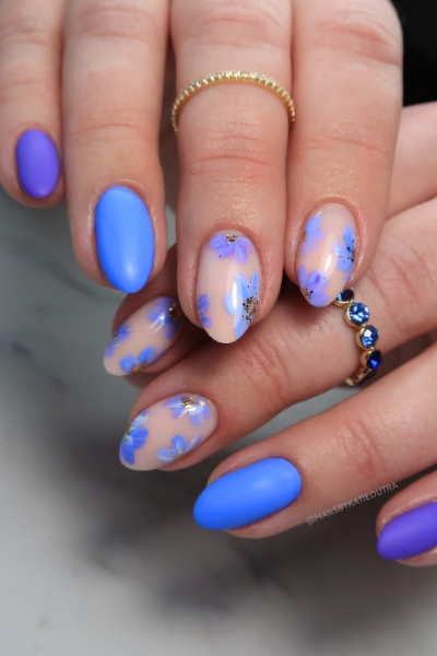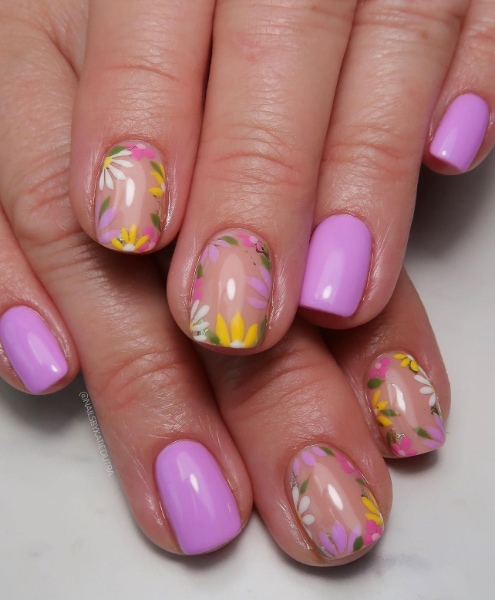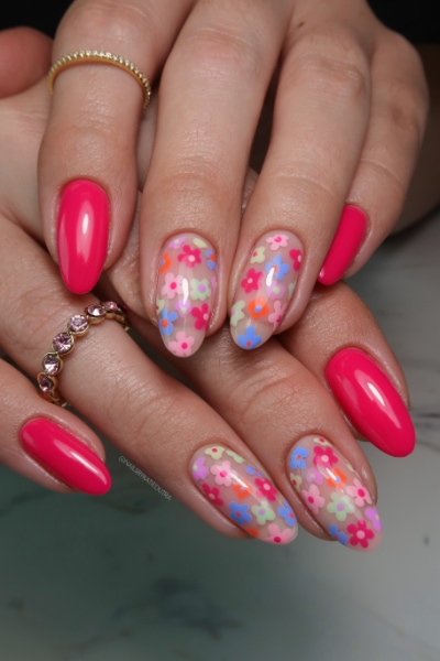 “My signature nail style is definitely hand-painted nail art designs. I love creating bold abstract looks and floral designs, and using plenty of bright colours,” she shares. “I get a lot of my inspiration from wallpaper, pottery, jewellery and make-up on Pinterest, as well as checking out what other nail artists are creating and thinking about how I can put my own twist on it.”