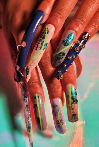 Affirming mustard yellow to be her favourite nail shade, the experimental and quirky Kierra lives to build, sculpt and create funky freestyle sets of nails, after inspiration jumps from the wings to bite her. “I find inspiration everywhere,” she cites. “From colours and textures to wall art, unique shapes and materials, then I put it all together to create something beautiful and unusual on the nail.”