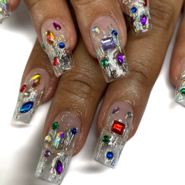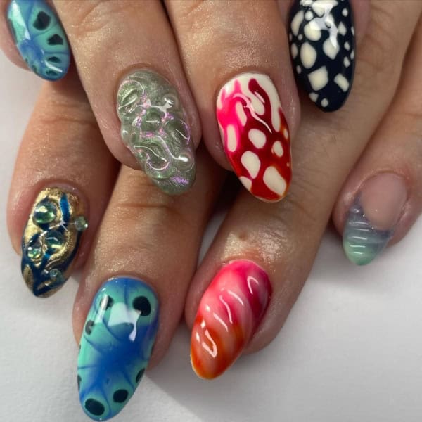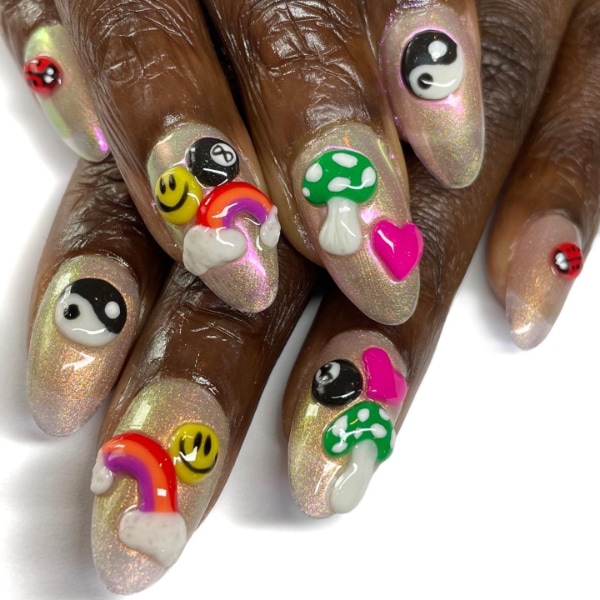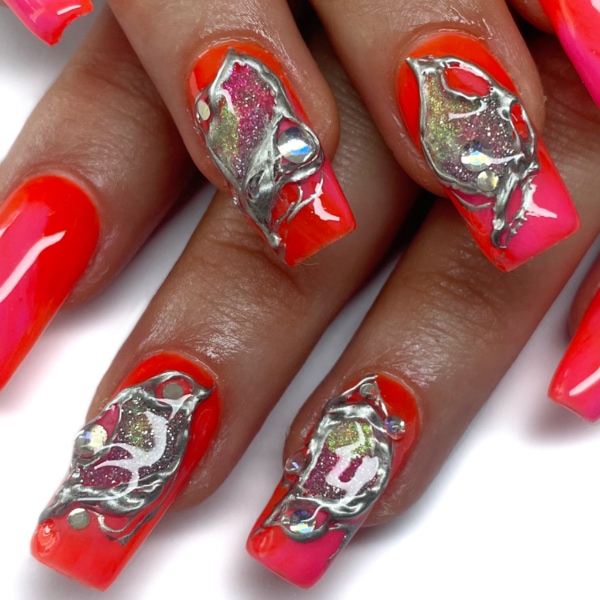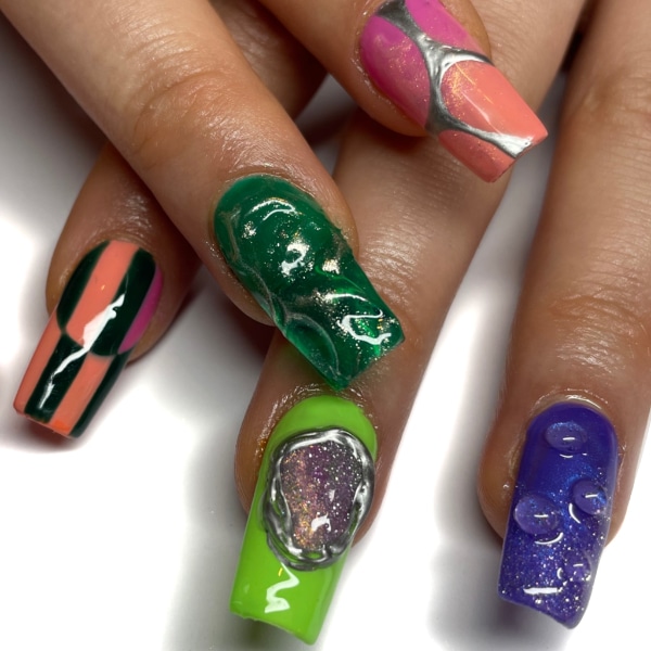 “I love experimenting with textures and 3D gels, mixing foils and chromes for futuristic looks. I think the unique nail looks appearing in the last few years are definitely a sign of products being as good as they’ve ever been, mixed with post-pandemic clients wanting to try something new.