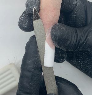 Step 5: Use a metal nail file, using the same techniques. Being so thin, you are able to tuck this right under. Make sure to support even more due to the flex of a metal nail file.