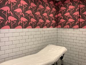 My salon colours are pink, white and grey. All my shopfronts are Farrow & Ball grey in colour and I run the grey theme throughout the flooring. I tend to use white metro tiles on most walls and then inject pink with Dream Nails pink neon signs, pink neon flamingos and neon pink ‘Nail Art Please’ signs. It is also worth remembering we tend to have a huge injection of colour provided by our nail varnish wall racks – they often cover entire walls of our salons.