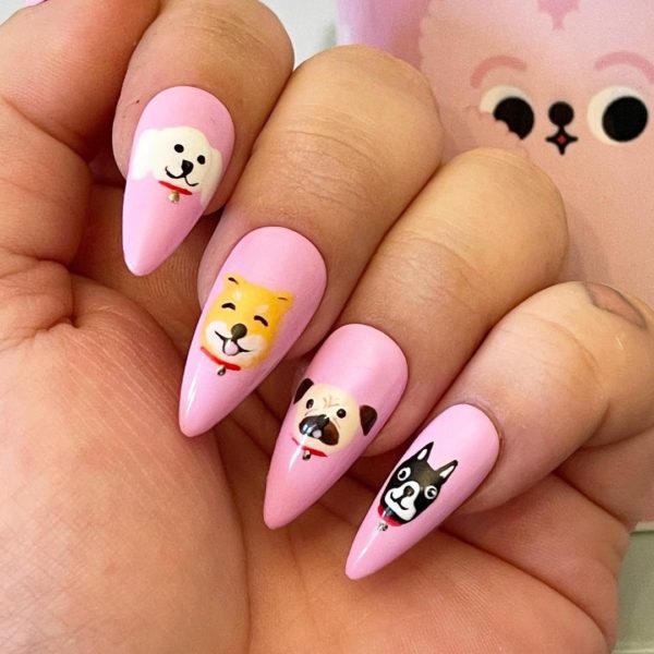I created the below dog nails by firstly looking on Instagram and Pinterest for cartoon-style images of dogs, as I knew these needed to be a bit fun! After the base colour, I worked in layers and cure each layer between, using a selection of dotting tools and brushes. My favourite brushes to use are an 11mm liner brush and another that I have trimmed to be even finer to do the tiny details. The good thing about working in layers is if you’re not happy, you can wipe with isopropyl and do that layer again before curing. The little red collars were an afterthought which I thought brought them all together. Often, I will sketch designs on paper, but for the dogs I just done this from online images.