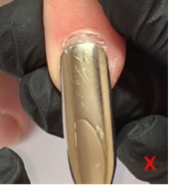 When working with scissors or cuticle pushers, you need to be aware of surrounding tissue, so it is important not to just go in blind with your cutting technique. It isn’t necessary to remove cuticle in one go, however satisfying this may seem. Firstly, identify what needs to be removed, then capture this in-between the blades. It can be ideal to work with curved blades, rather than straight as the sharpest point of the tip of the blades will face away from surrounding skin. When working with curved blades, when ready to cut you can turn the blades upwards so that only what is intended to be removed will be cut as the tip will face upwards, away from surrounding skin.