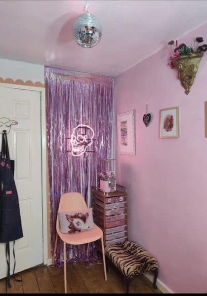 After making the decision to work from home, Tara turned her spare room into a little nail sanctuary and tried to make it resemble a salon as much as possible. “My inspiration for my nail space has come from tattoo shops and alternative beauty salons. I collect weird nik naks from charity shops and art from small businesses. I am always getting complimented on all the weird bits I have in my salon and I love it.