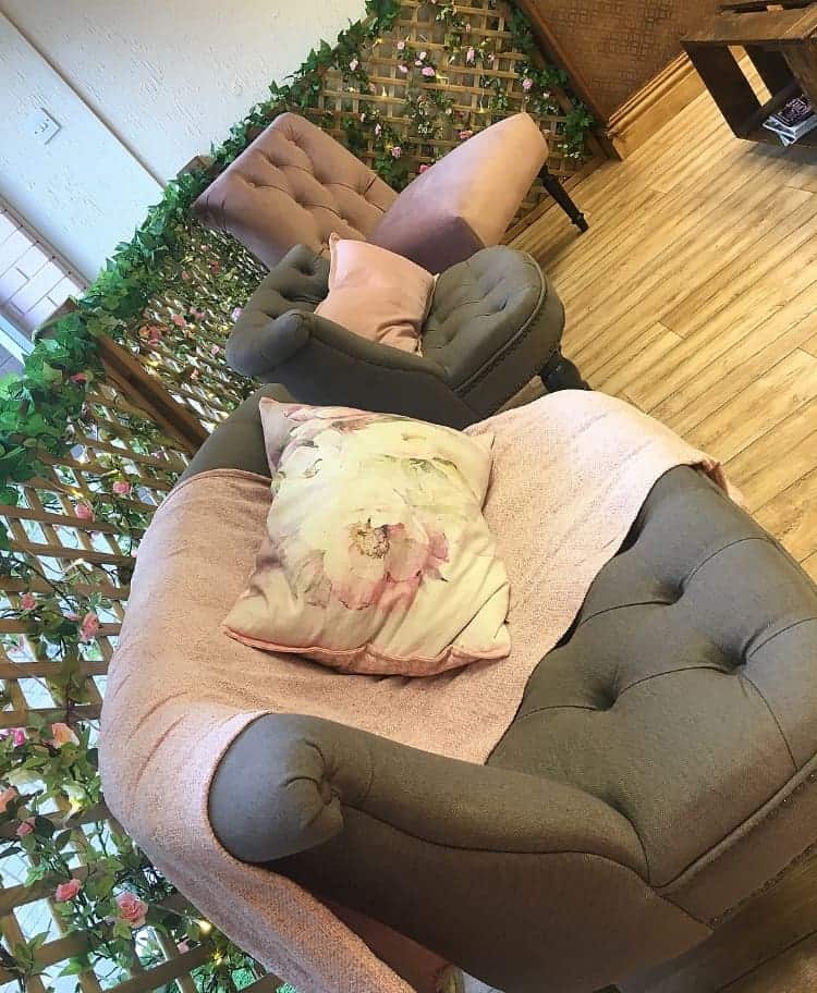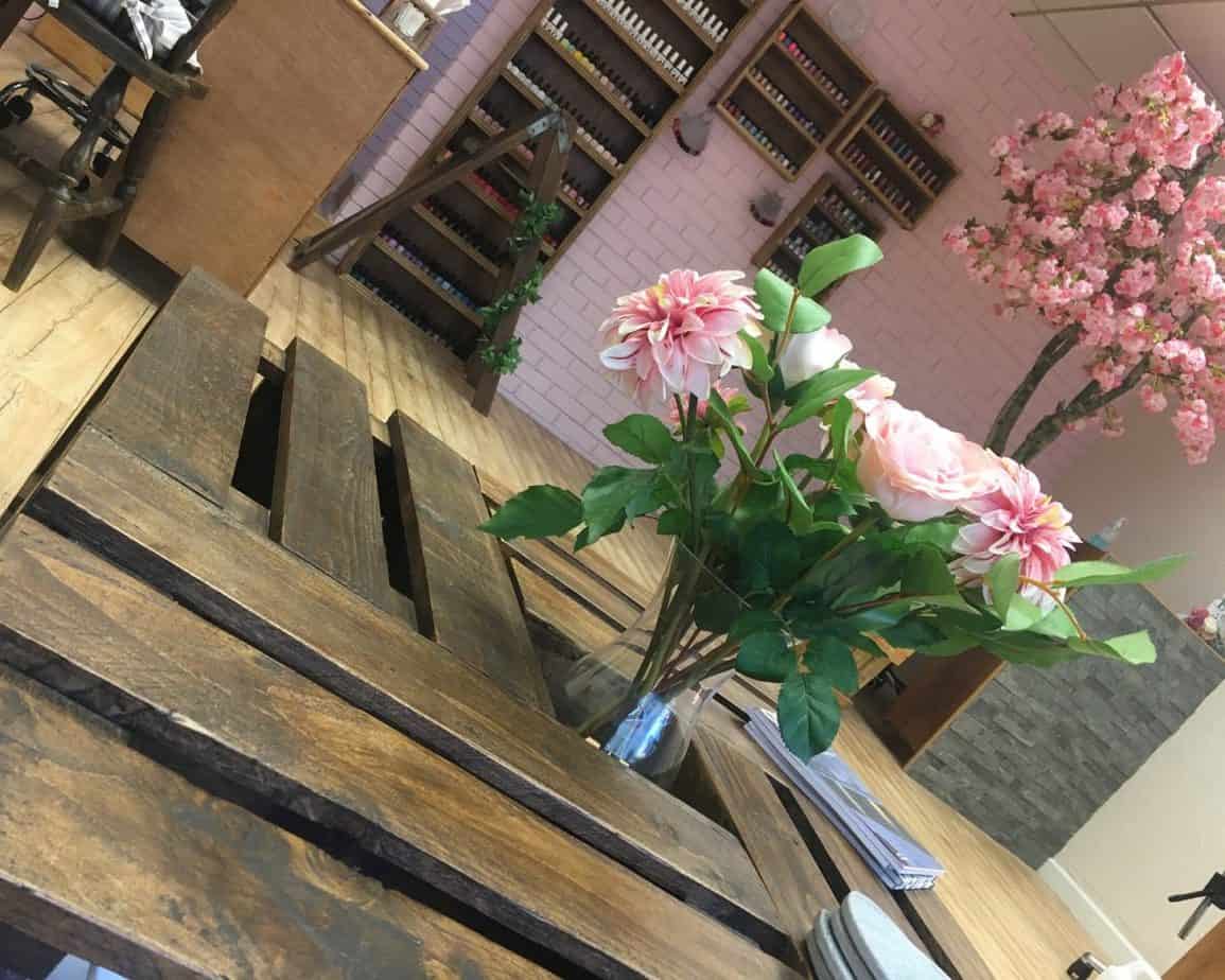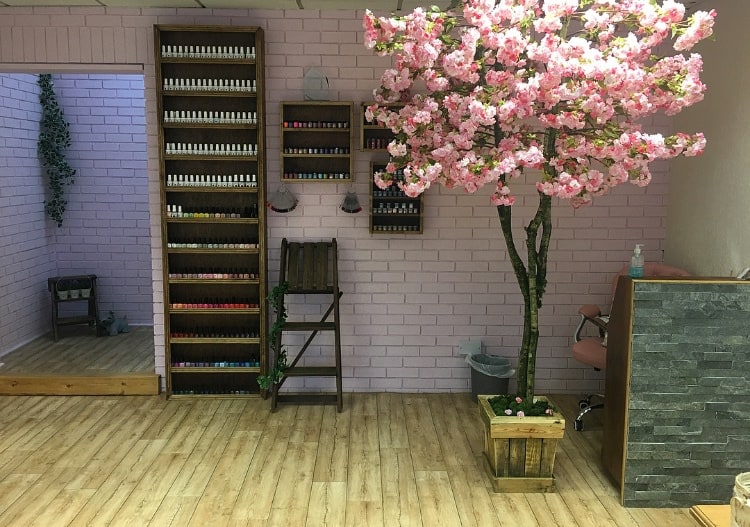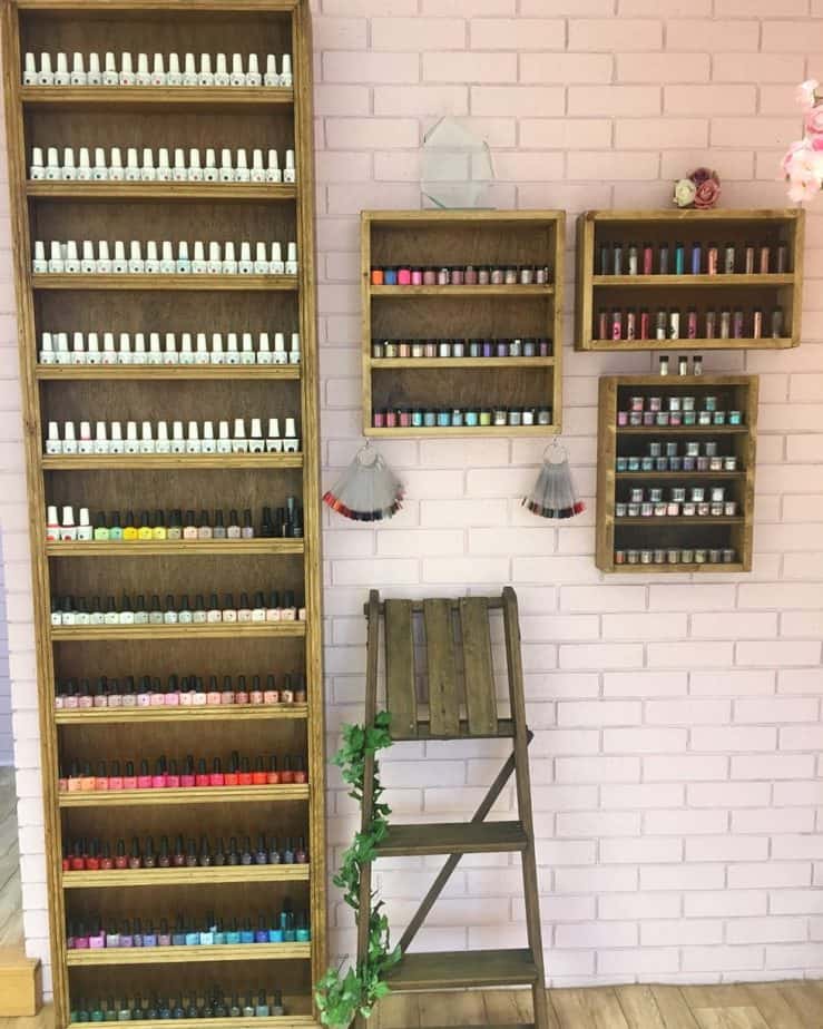 To grow her salon’s theme, Sophie called on help. “I am very fortunate to have very skilled family members,” adds Sophie. “They created all my shelves and coffee table from scratch from pallet wood. They also altered my nail desks so that the lamps are fitted inside the desk using a glass panel. It’s freed up so much space on the table.”