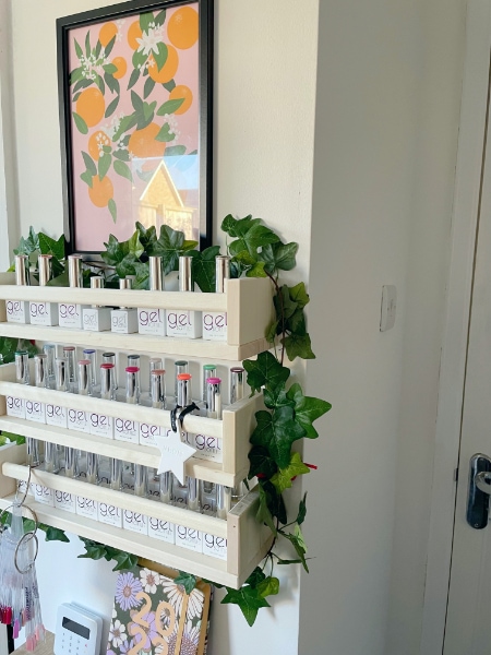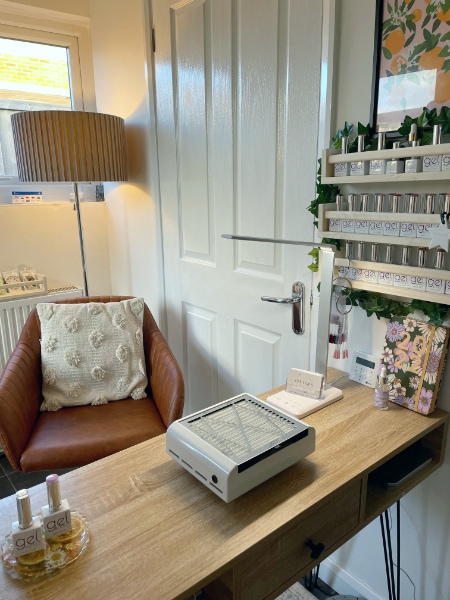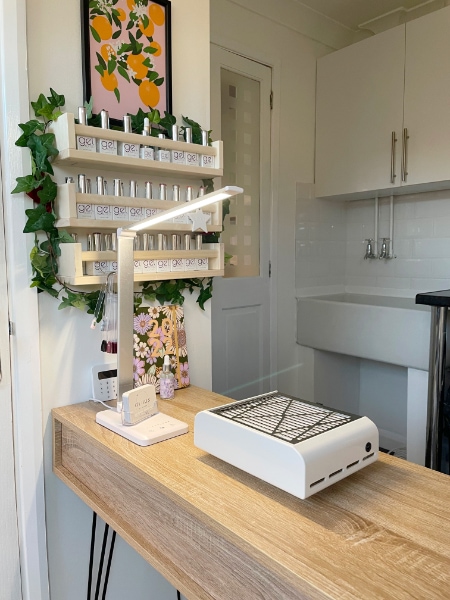 “I wanted the salon to be a calming, cosy space for clients to feel relaxed and pampered, while I get to work creating exciting and funky nail designs for them,” Rebecca beams. “I think the décor influences this calm feel and the little colour pops and accessories show that there is another more outgoing and bold side to my little business.”