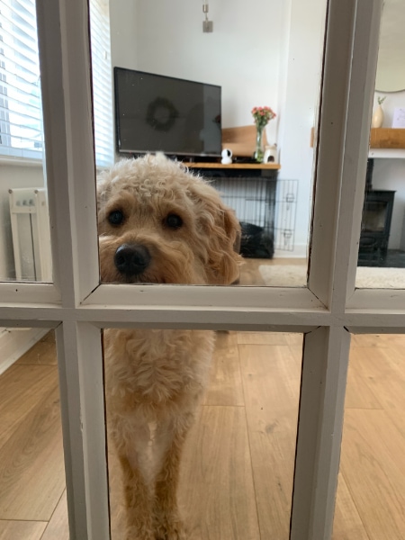 While Georgia’s favourite feature of her set up is her cream boucle chairs with chrome gold legs, an added bonus to her salon is her gorgeous doodle dog.
