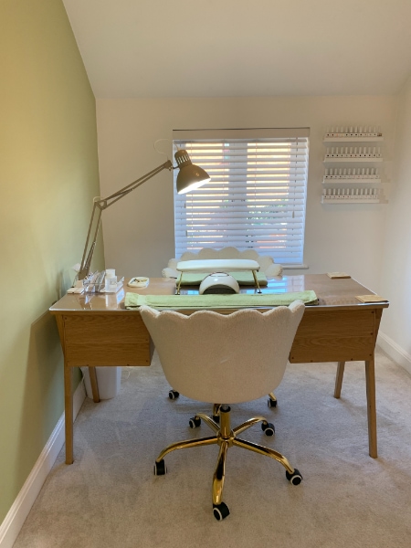 “My nail desk is solid wood and I have a matching chest of drawers to go with it. The desk is one I bought for doing my teaching paperwork, but with the help from my dad, we cut a hole out of the back, so that two people can sit at it,” she says. “I’m so glad I bought some acrylic to protect the top, as my acetone drips would have destroyed the wood on my desk by now.