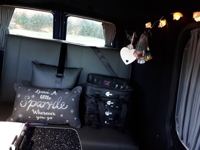 “I wanted to create an glitzy and sparkly yet classy and glamourous set-up. I chose a colour scheme of black, silver, grey and white, as it would suit the metallic dark blue van. I also wanted black, glittering worktops and table, as well as a grey sparkly floor. I think a bit of sparkle makes everyone happy! I believe the van caters to young and old; it’s quirky, happy, sparkly and glamorous.”