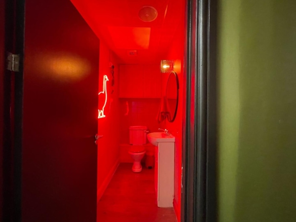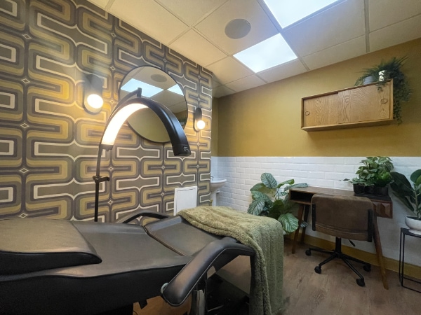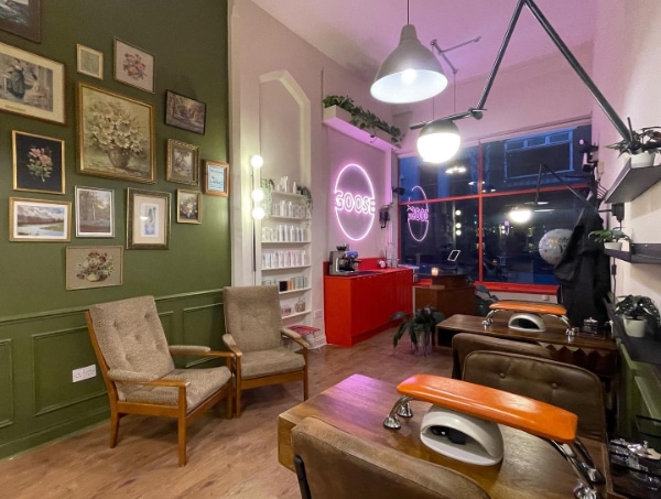 The quirky space serves up a laid-back atmosphere, with photos in mismatched frames set upon olive green walls, and dark wood accents and cosy armchairs exuding a comforting feel in which clients can enjoy a treatment. “I’ve spent many, many years on my Pinterest board. I find inspiration from so many things, so it was hard to pick a theme and stick to it. I’d say GOOSE is a mix of retro, vintage, industrial, urban jungle and neon vibes.