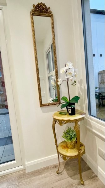 “I have a bit of a garden theme going on, such as the emerald green chairs, plants and the floor standing tree,” she reveals. “As I am still trying to keep in with the elegant theme, I have some vintage style gold furniture also which I feel really works with the green!”